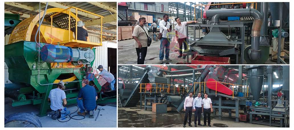 在工作原理上輪胎撕碎機采用低速高扭矩轉(zhuǎn)動的主軸電機直連設(shè)計通過刀片卡角作用將整個廢舊輪胎進行破碎加工,經(jīng)過雙軸撕裂加工后的廢舊輪胎塊在滾篩的作用下實現(xiàn)在整個破碎過程中小于或者等于50*50的物料從圓網(wǎng)篩中漏出,進入后續(xù)工序;大于50*50的物料經(jīng)圓網(wǎng)篩返回到破碎室進行循環(huán)破碎,直至膠塊大小符合要求后排出撕碎機。經(jīng)過排出的大塊輪胎顆粒。